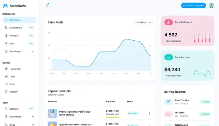MaterialM combines a contemporary dashboard interface for React developers with the adaptability of Tailwind CSS.