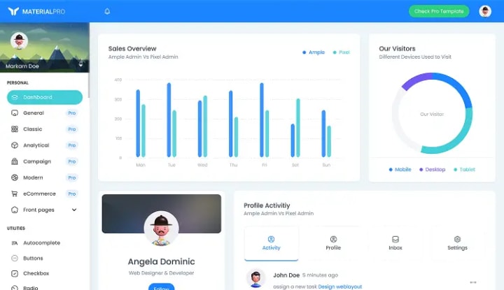 With side navigation, stat cards, charts, and user pages, Matdash offers a user interface that is influenced by materials.