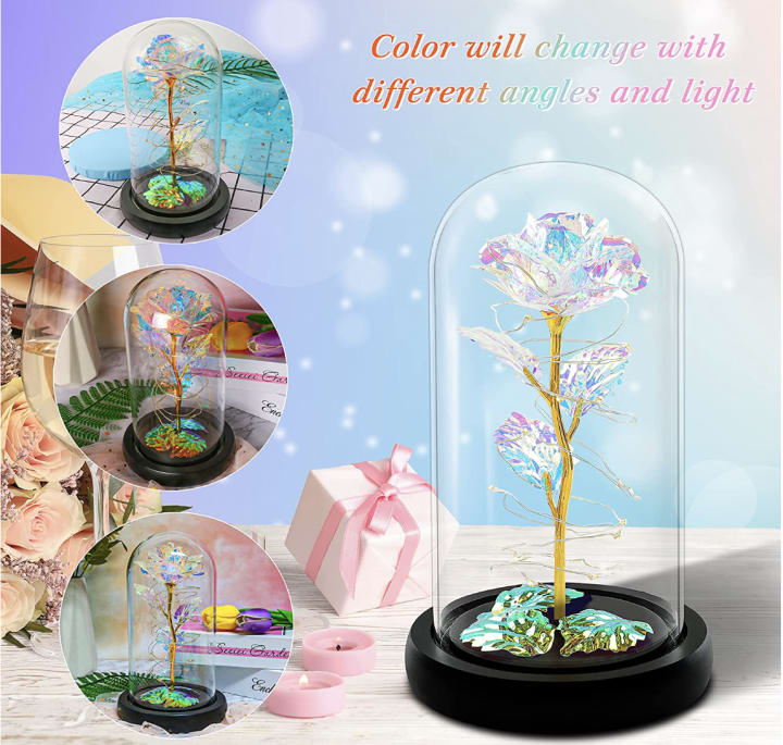 This gift is not just for Valentine's Day, but it also perfect for any romantic occasion such as anniversaries, birthdays, or just to tell your loved one how much you care. It's a timeless, classic and elegant gift that will be cherished for years to come. The glass dome can be reused as a display case for other items, making it a gift that keeps on giving. The Colorful Rose Flower Gift in a Glass Dome is perfect for any woman who loves flowers and wants to have a romantic and elegant decor in her home.