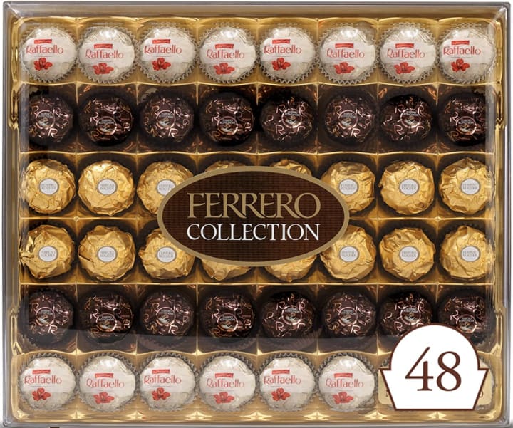 The Ferrero Rocher Collection is the perfect Valentine's Day gift for the chocolate lover in your life. This collection includes 48 pieces of fine hazelnut milk chocolates, an assortment of coconut candies and chocolates. Each chocolate is made with a whole hazelnut surrounded by a creamy hazelnut filling, wrapped in milk chocolate and a crispy wafer, all coated in a layer of finely chopped hazelnuts.