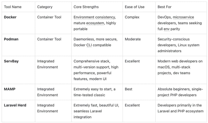 Verdict: For Laravel developers, Herd's experience is nearly perfect. But its strength is also its limitation: it primarily serves the Laravel ecosystem. If you need to manage multiple Node.js versions or require additional services like PostgreSQL or Redis, Herd might not be "all-in-one" enough.