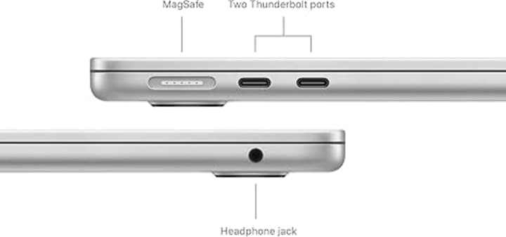 The MacBook Air features two Thunderbolt ports, a headphone jack, Wi-Fi 6E, Bluetooth 5.3, and a MagSafe charging port. These options provide excellent flexibility for connecting peripherals, transferring data, and ensuring fast and stable internet connectivity. The device also supports connection to two external displays with the laptop lid closed, allowing for a versatile multi-monitor setup.