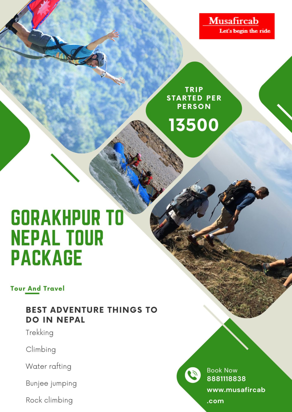 Nepal offers a diverse range of adventure activities that cater to thrill-seekers and nature enthusiasts alike. With Musafircab. you can ensure a safe and memorable adventure experience in Nepal. Discover the enchanting land of Nepal with our customized Gorakhpur to Nepal tour package, Nepal Tour Package from Gorakhpur Whether you are planning a business trip, solo adventure, family getaway, romantic escape, or group excursion, our customized packages with Musafircab are designed to meet your unique needs. For inquiries or to book your trip, call or WhatsApp us at +91–8881118838.
