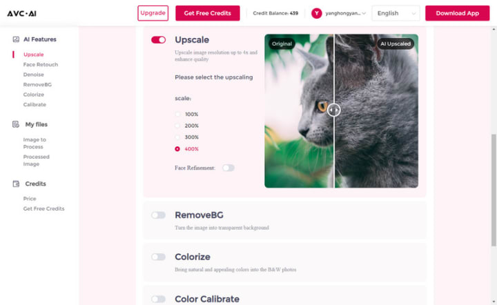To increase images' quality, you are suggested to select the Upscale model here. It offers 100% to 400% options for scale size, just choose the size based on your demands. If needed, you can also switch on the Face Refinement option to enhance portrait photos.
