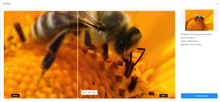 After the upscaled process is completed, simply switch to the Processed Image tab and click on the Eye icon to preview the original and upscaled high-quality images' result by dragging the slider bar.