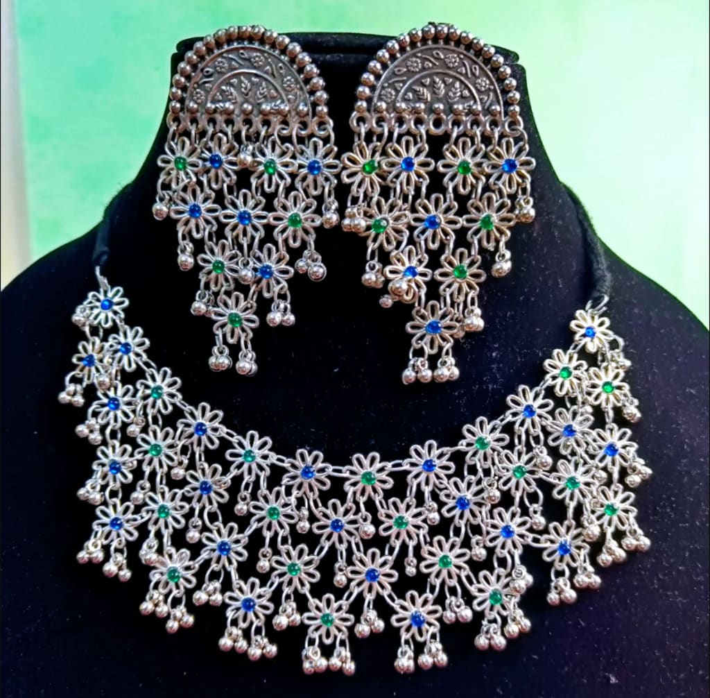 This type of choker necklace set can be paired with a wide range of outfits, including sarees, lehengas, and salwar suits. It is especially popular for weddings and other formal occasions, but can also be worn for more casual events. The oxidized silver finish gives the necklace a unique and distinctive look that sets it apart from other jewelry pieces.