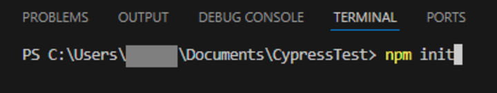 Launch Visual Studio Code and open the integrated terminal to install Cypress using the following commands: