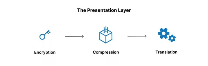 - This layer prepares data into a format that the application layer can understand. Simply, it is responsible for translation, encryption, and data compression.