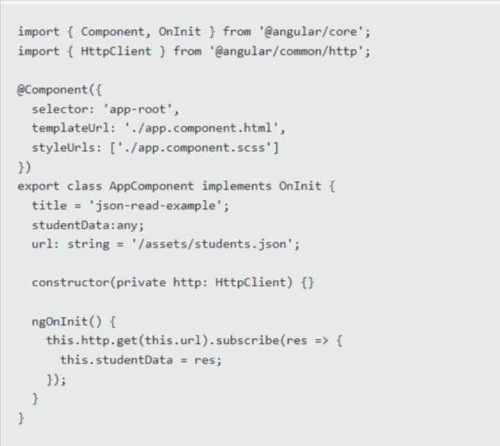Using HTTP Client:- This is the most popular method. You can make a GET request to the local Angular JSON assets and retrieve the JSON file.