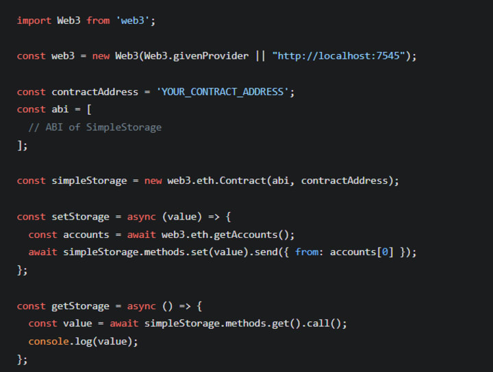 Use Web3.js to connect your frontend with your deployed smart contracts. Here’s a basic example of how to connect to the Ethereum network and interact with the SimpleStorage contract.