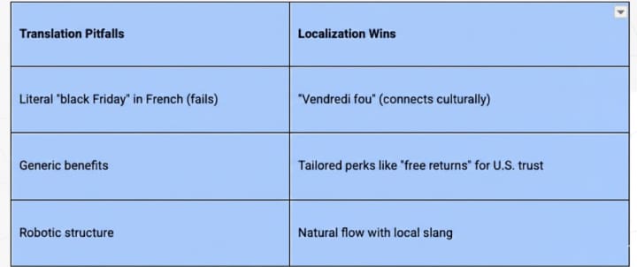Running pages through Google Translate creates stiff text that AI flags as low-effort. A US description saying "free 2-day shipping" confuses Germans expecting "kostenloser Versand in 3 Tagen." AI boosts pages written with local flavor, dropping robotic ones from top spots.
