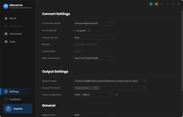 You can also specify the output folder to save the downloaded Amazon Music songs. What's more, if you want to organize the output file, you can also customize the output organized way like Artist, Album, Playlist, Artist/Album, or Album/Artist.