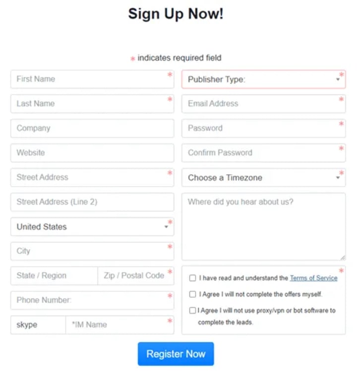 Start by visiting cpagrip.com's official website and click on "register" button at the top right corner of the home page. You can do this if you're using a phone, tablet, or PC, the site works well on all devices.