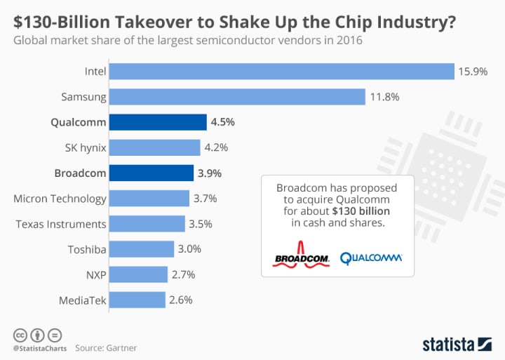 From Investopedia, we gather that Intel is the largest semiconductor company in the world, based on its 2020 revenue of $77.9 billion.