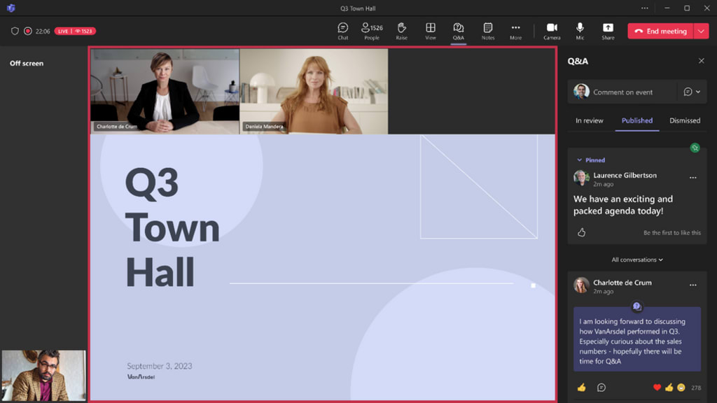 Presenters and organisers will benefit from joining a virtual green room together to make sure they can prepare for the town hall. Presenters have a dedicated, separate space away from attendees to connect and collaborate, stage content, go over scripts and make sure they’re prepared to present. Additionally presenters and organisers have a dedicated chat to communicate throughout the event which attendees can’t access. The welcome screen that attendees see whilst presenters are in the green room during town halls will remain the same as with Teams Live Events.