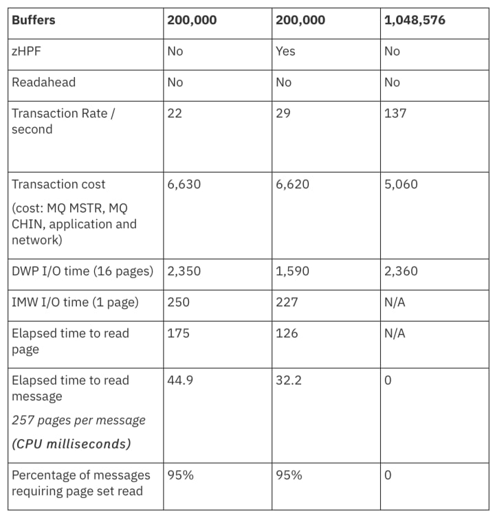 The configuration with sufficient buffers such that page set reads are avoided makes a significant difference to both transaction rate (7–10 times) and cost.