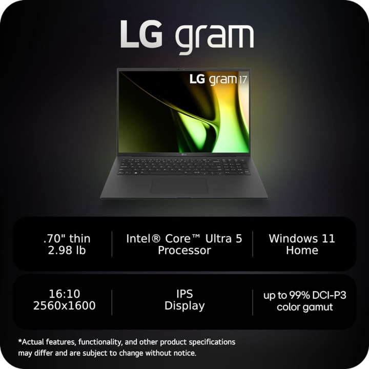 The LG gram 17-inch Lightweight Laptop is an excellent choice for users seeking a combination of a large display and ultra-portability. Its lightweight design, robust performance, and long battery life make it ideal for professionals, students, and anyone who needs a reliable and portable laptop. The high-resolution display and powerful Intel Evo platform further enhance its appeal, making it a versatile device for a wide range of applications. Whether you're working on complex tasks, enjoying multimedia content, or simply browsing the web, the LG gram 17-inch delivers a premium computing experience.