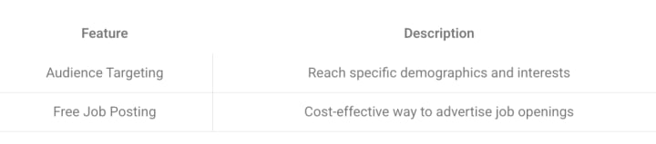 Facebook Jobs is a free tool that empowers recruiters to post job openings on the world’s largest social media platform, boasting over 2.8 billion monthly active users. Recruiters can target specific audiences based on demographics, interests, and geographical location, making it easier to reach potential candidates who fit job criteria.