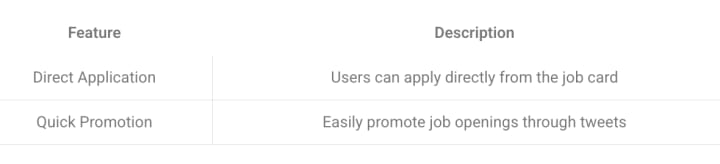 Twitter Job Cards are a free resource on the Twitter platform, which has over 330 million monthly active users. This tool enables recruiters to promote job openings through tweets that include detailed job cards showcasing job title, location, and description. This format encourages direct job applications from interested candidates.