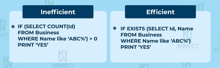 4️⃣ To check the existence of records, use EXISTS() rather than COUNT(): Both EXISTS() and COUNT() methods can be used to check the existence of a record entry in the table. The EXISTS() method is more effective as it exits processing as soon as it finds the first entry of the record in the table. The COUNT() method would scan the entire table to return the number of records in the table that match the provided constraint.