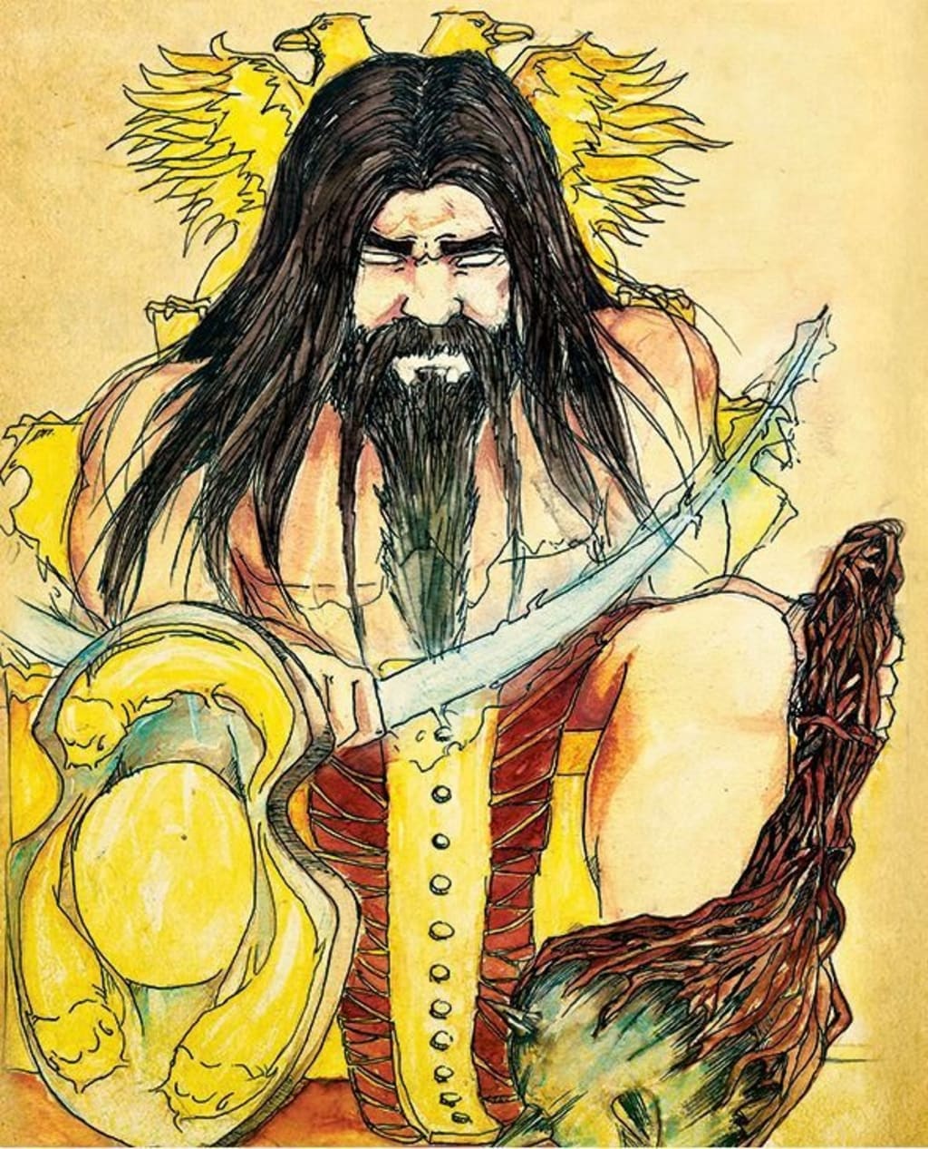 With a great roar, Baybora broke free of the serpent's coils. He struck a mighty blow with his sword, and the serpent's head rolled to the ground. The creature was dead.