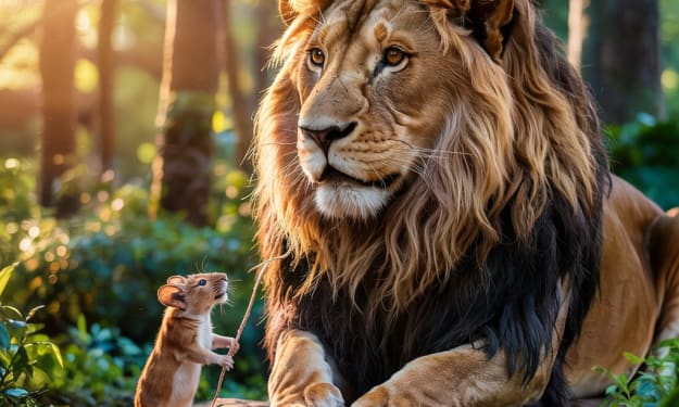 The Lion and the Mouse: A Tale of Unexpected Friendship In the heart of a vast and peaceful forest, where the trees stretched high into the sky and the air smelled of fresh pine and earth, lived a mighty lion. His golden mane shimmered under the sun, and his deep, rumbling roar could be heard across miles of forest. Every creature in the woods respected the lion for his strength and power. He was the king of the forest, feared by many and admired by most.