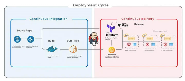 In the diagram above, we can see how Terraform integrates with the standard CI/CD pipeline. Terraform plays a significant role in the Continuous Deployment part of the pipeline, where it is responsible for provisioning instances on Amazon’s ECS cluster. Terraform also quickly spins up to three parallel Dev, UAT, and Prod environments in the above scenario.