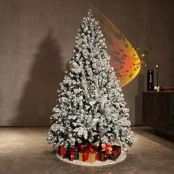 When it comes to pre-lit trees and the allure of a snowy winter landscape, the Asinse 7-foot Pre-Lit Snow Flocked Christmas Tree with 450 Chasing Warm LED Lights is an excellent option. It makes a warm and lovely ambiance with its snow-flocked branches and shimmering LED lights, making it the ideal focal point for your holiday celebrations. This tree adds a bit of winter enchantment to your house, making your holidays full of wonder and coziness—whether you're decorating for a family get-together or just enjoying the joy of the season.