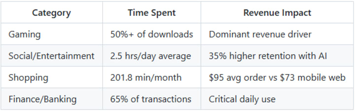 Real talk? Shopping apps changed the game. Users spend an average of 201.8 minutes per month on shopping apps compared to just 10.9 minutes on mobile web. And they spend more too — $95 per order via apps versus $73 on mobile websites.