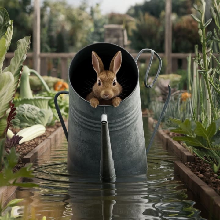 As the chase continues, Peter becomes increasingly frightened and disoriented. He hides in a watering can filled with water but soon realizes that he must leave to avoid being caught. After several close calls, Peter finally manages to slip through a small window in a tool shed and escapes Mr. McGregor's clutches. Exhausted and shivering, Peter rests for a moment before continuing his escape. This chapter highlights Peter's fear and the escalating danger he faces.