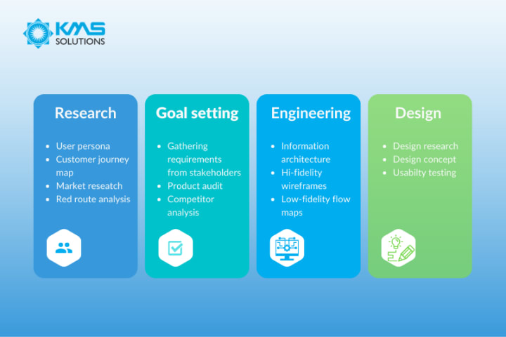 The main phases in the super app UI/UX design process comprise: