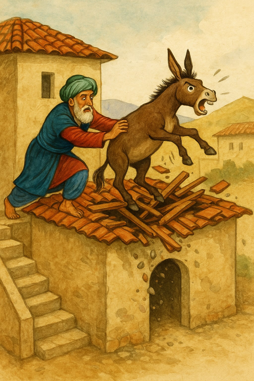Now alarmed, Mullah realized that the roof was not strong enough to handle the donkey’s kicks. It was a fragile structure, not built to withstand such force. Realizing the danger, he rushed back upstairs and tried once again to pull the donkey toward the stairs. But the donkey remained as stubborn as ever, continuing its destructive behavior.