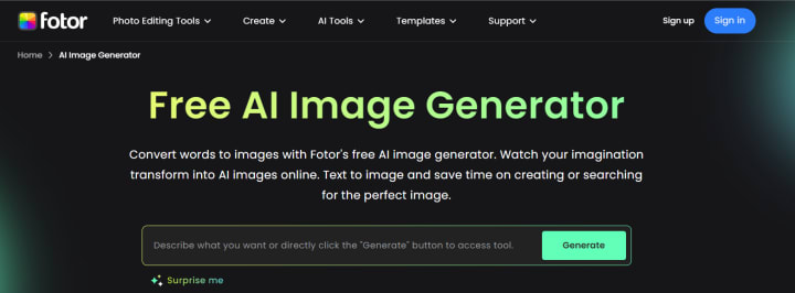Fotor is a widely used online photo editor and graphic design tool that includes an AI image generator feature. With Fotor, users can create images from text prompts across different categories, such as animals, landscapes, people, and food. Additionally, Fotor offers various editing tools to further customize the generated images.