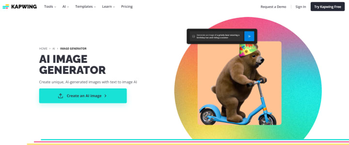 Kapwing is a powerful online video editor and content creation platform that includes an AI image generator feature. With Kapwing, users can create unique AI-generated images using text prompts. Various image sizes and formats are available, and the generated images can be further edited using Kapwing's tools.