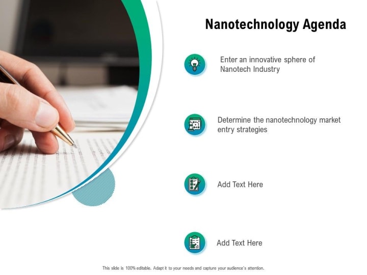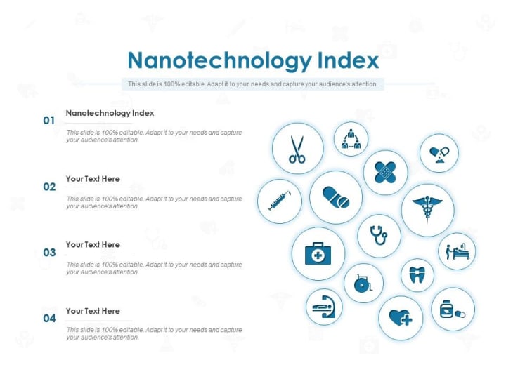 It describes possible breakthroughs in computers, medicine, and other fields due to nanotechnology progress - one of science's most promising frontiers. Nanotechnology sounds very complex, but SlideTeam's nanotechnology templates will help you learn more about this fascinating topic. Our team of experts has created a series of easy-to-understand and engaging presentations for all audiences. We've even included helpful diagrams, charts, and graphs so that everyone can understand the concepts behind nanoparticles. Download them now.