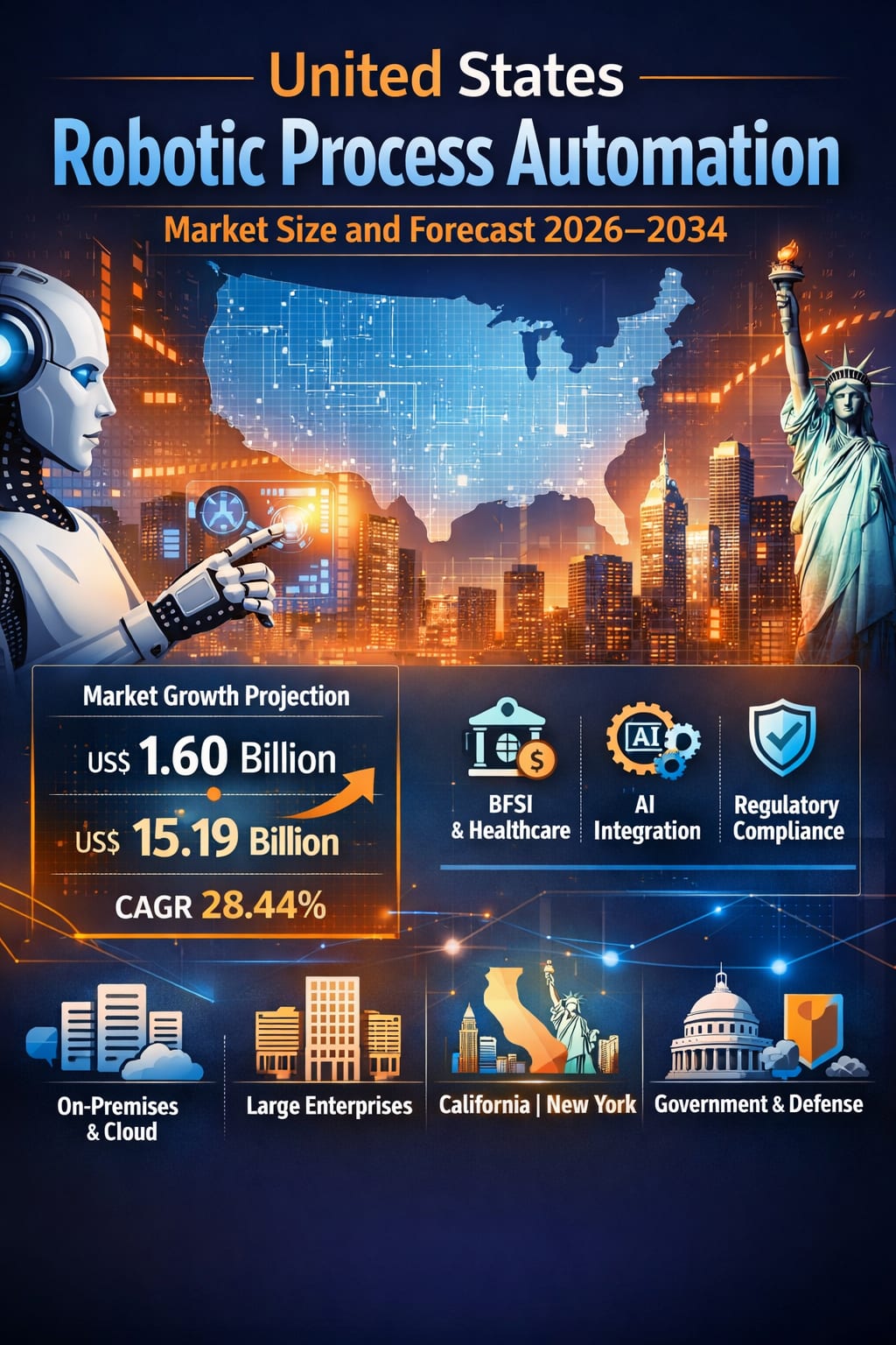 This extraordinary growth reflects the accelerating adoption of automation technologies across banking, healthcare, manufacturing, retail, government, and telecommunications. Enterprises are embracing RPA to improve operational efficiency, reduce costs, enhance compliance accuracy, and integrate digital workforces alongside human employees. As artificial intelligence (AI), machine learning (ML), and natural language processing (NLP) converge with traditional RPA platforms, automation in the U.S. is rapidly evolving from simple task execution to intelligent, end-to-end business orchestration.