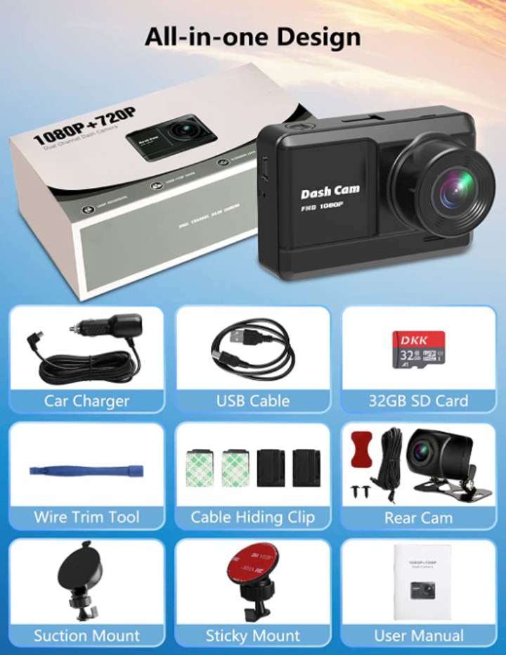 The dash cam comes with a 32GB SD card and two mounting options: a suction cup for flexible placement and a 3M bracket for stability. With loop recording and accident lock, the dash cam ensures that video is always available when needed.