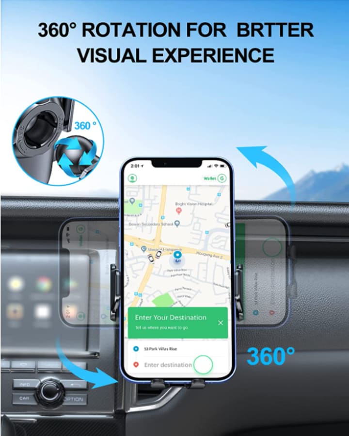 The charger mount also features an upgraded smart chip with multiple protections to ensure safety during fast charging. Its 2-in-1 design makes it a perfect car phone mount, which gives you a safe hands-free experience and avoids cluttered cables. The 360° swivel joint allows you to adjust the view between horizontal and vertical freely, and the one-key release arm enables you to retrieve the phone with one hand.