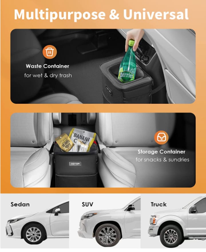 The HOTOR car trash can is compatible with various types of vehicles, including sedans, SUVs, and trucks, making it an effective solution for people who want a neat and organized car interior. Overall, this car trash can offers great functionality, durability, and versatility, making it a must-have for any car owner.