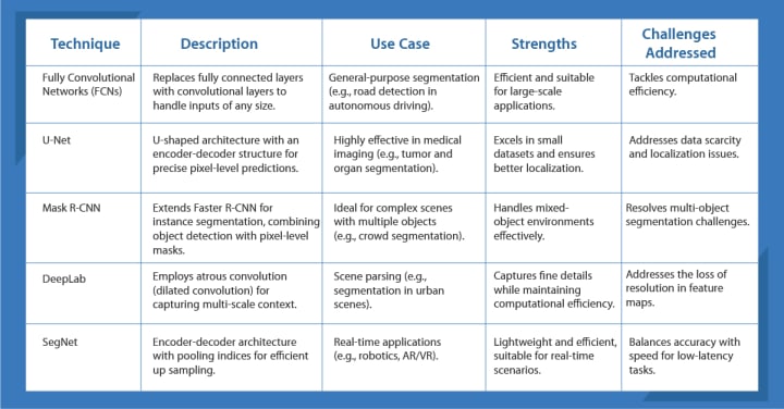 When exploring the key techniques in semantic segmentation, it’s is essential to understand their unique strengths and applications. Different models cater to specific needs, balancing speed, precision and complexity. FCNs prioritize computational efficiency but may compromise on precision, while U-Net ensures accuracy in smaller datasets. Mask R-CNN excels at combining object detection with segmentation, DeepLab captures a multi-scale context for complex scenes, and SegNet is tailored for real-time tasks. Below is a comparative table summarizing these techniques, their strengths and the challenges they address:
