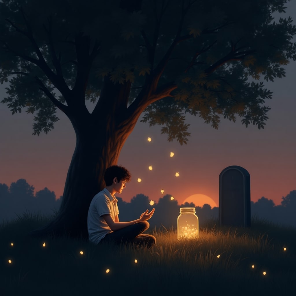He sat back against the trunk of the sycamore, letting the silence stretch. The sky was deepening now—soft oranges fading to indigo. The moment the fireflies would’ve arrived.