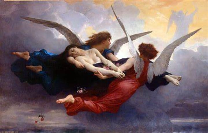 French academic artist William-Adolphe Bouguereau was known for his lifelike portrayal of the human form in the late 19th century. This artwork is among his famous paintings relating to angels. It depicts a woman being taken into the clouds unaware that she is being carried by angels.