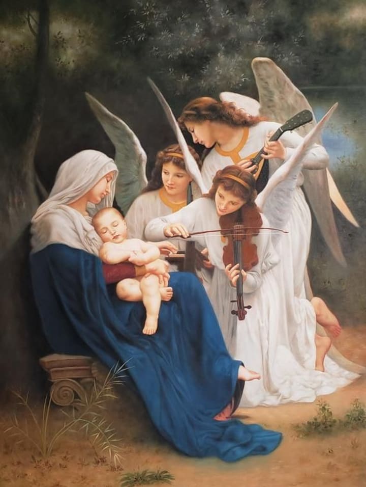 French academic artist William-Adolphe Bouguereau was famous for his angel paintings. In this artwork from the Renaissance period angels surround Virgin Mary who is holding a sleeping baby Jesus. The angels make sure they have successfully put the baby to sleep with their music.