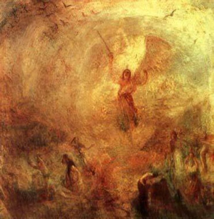 English Romantic artist Joseph Mallord William Turner was known for his landscape and marine paintings but occasionally created a religious themed painting. In this artwork one can see an angel standing in the sun with a long sword about to exact vengeance upon mankind. Figures can be seen to the lower right and left of the canvas. To the left are Adam and Eve lamenting over the death of their son Abel of the hands of Cain, To the right the figure of Judith beheads the Assyrian General Holofernes to attempt to save her people from death,
