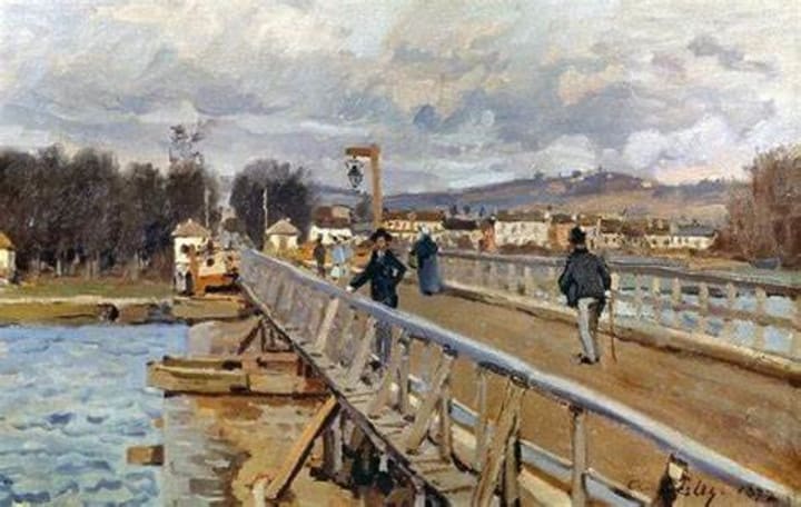 British Impressionist artist Alfred Sisley created this painting of a bridge in London, England. The bridge was known for its majestic pillars and the artist would sit beneath the bridge and paint. You can see the setting sun creating a crimson hue cast across the bridge as boats pass by along the river.