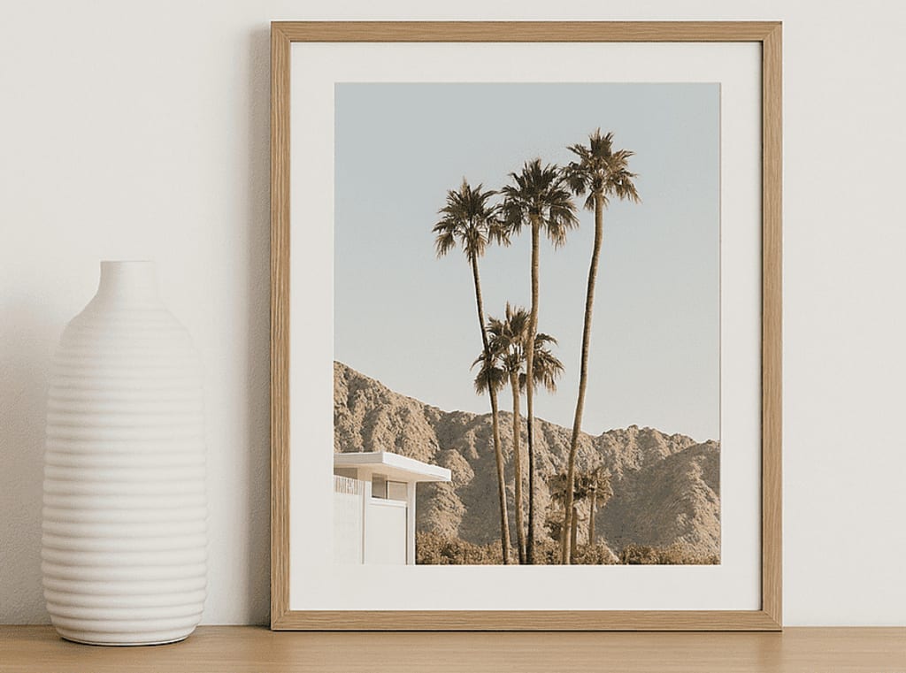 Boho-Chic and Eclectic Styles: Pairing a Palm Springs print with rattan furniture, indoor plants, and vintage accessories can create a cozy yet stylish atmosphere.