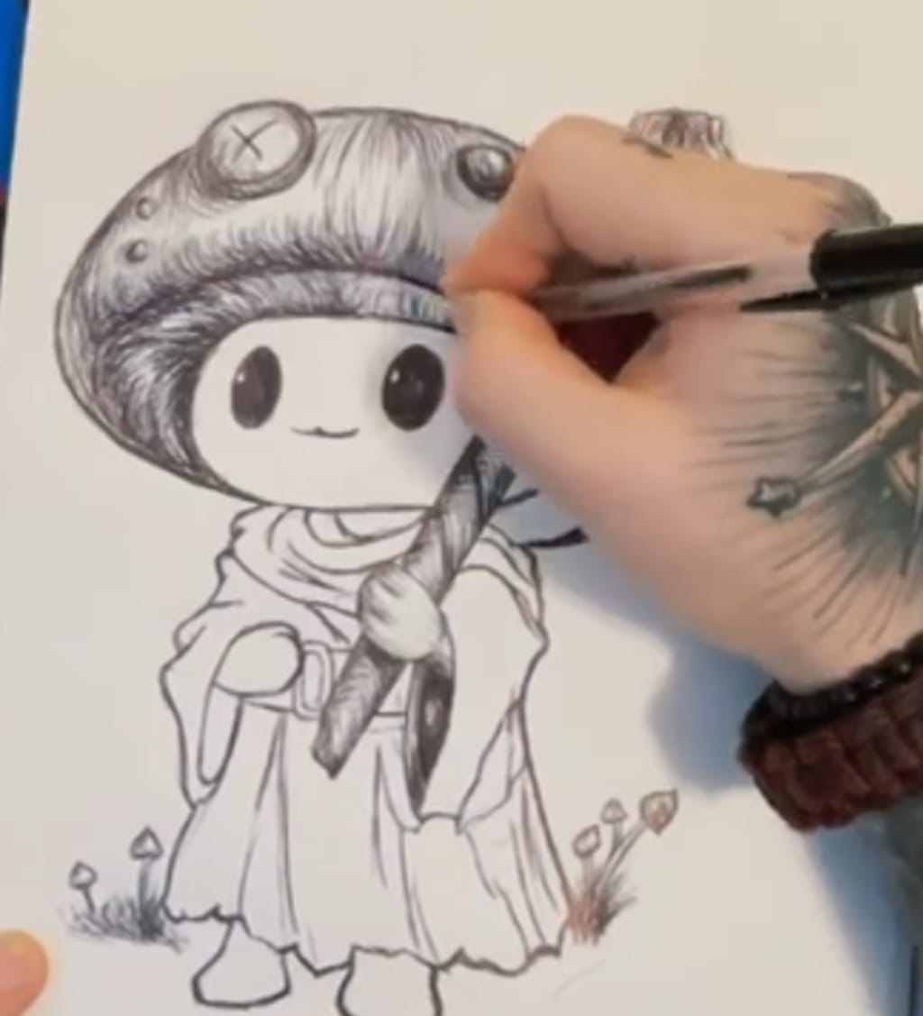As we start drawing Fungus’s head, let’s imagine his early life. Fungus was born to a family of farmer mushrooms in the heart of the Elderwood, a forest teeming with life and magic. His parents, Cap and Stem, were simple folk who tended to the mushroom patches, ensuring the village had a steady supply of food and materials. From a tender age, Fungus was drawn to the forest, captivated by the myriad of mushrooms and herbs that grew there. His parents encouraged his curiosity, often accompanying him on walks and teaching him the names and uses of different plants, like the glowing Nightcap and the healing Dewdrop Shroom.