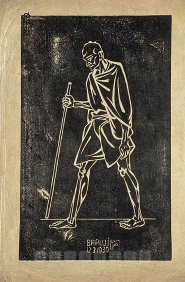 Indian artist Nandalal Bose was inspired by Mahatma Gandhi. In 1930 he created this arwork with the caption Bapuji. The painting is a monument to the artist's strong respect for Gandhi and is on permanent display in the National Gallery of Modern Art in Delhi.