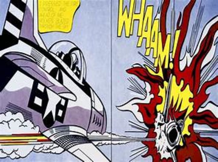 Lichtenstein painted this pop art piece in a comic strip composition on two canvases. One depicts a fighter jet and the other an enemy plane.