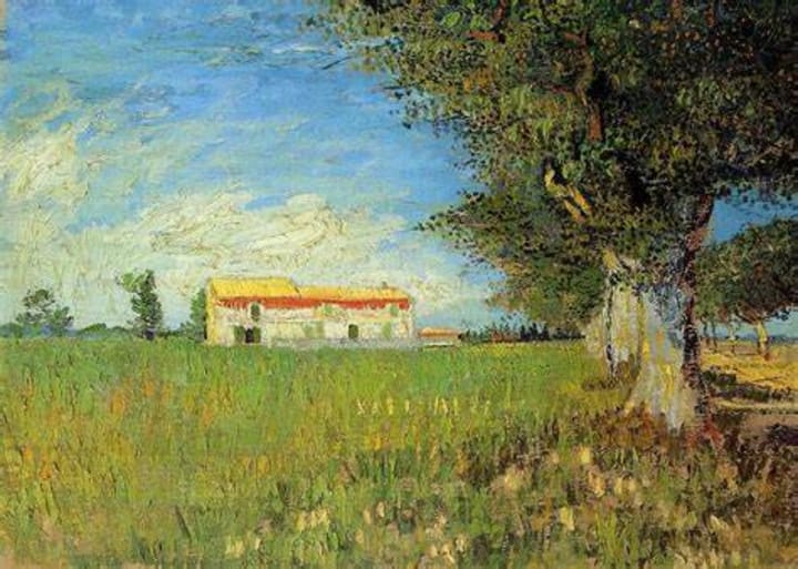Dutch artist Vincent Van Gogh made use of bright, unmixed colors to paint the farmhouse in a field near Arles, France. He tended to use a variety of brushstrokes and gave minute details to make things stand out like the tree in this artwork.